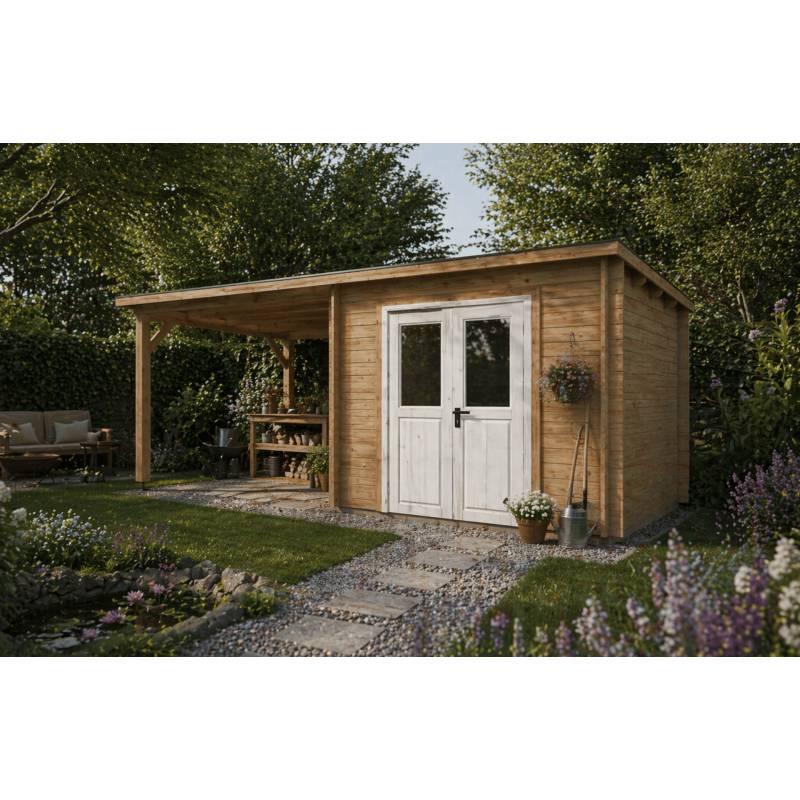 Robert B to domek o powierzchni 17,3 m² z wymiarami 320×540 cm, wyposażony we własną wiatę. To idealne połączenie: zamknięta część na narzędzia lub sprzęt oraz zadaszone miejsce, które chroni przed deszczem i słońcem — znakomite do warsztatu, jako miejsce wypoczynku lub przestrzeń pomocnicza.