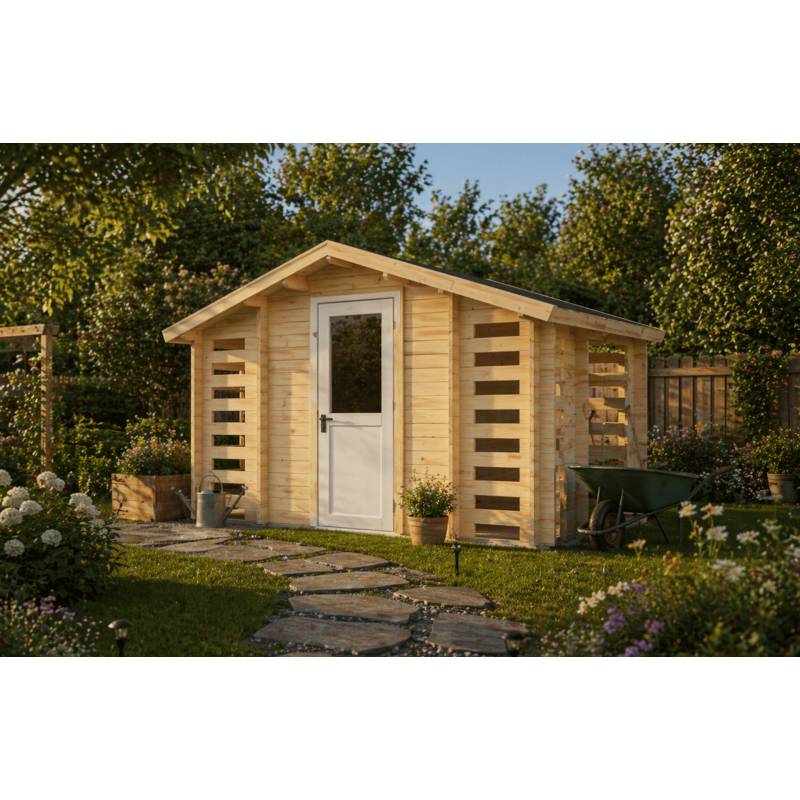 Domek narzędziowy KOKOSZKA B 9,3 m² z drewutniami to funkcjonalny i praktyczny projekt do każdego ogrodu. Przestronne wnętrze oraz dwie boczne drewutnie zapewniają wygodne przechowywanie narzędzi i drewna, a solidna konstrukcja z drewna 28 mm gwarantuje trwałość i wygodę użytkowania na lata.
