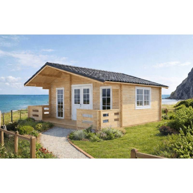 Domek letniskowy CHABER o powierzchni 33,6 m² (600×600 cm) z tarasem i bala 44 mm — bez podłogi, byś sam dobrał wykończenie. Przestronny salon z aneksem, estetyczne przeszklone drzwi i świetliki wpuszczają światło. To idealna przestrzeń do wypoczynku, weekendowego życia lub wynajmu turystycznego. Naturalne drewno, charakter i komfort w jednym. Nie czekaj — wybierz przestrzeń, która zmieni Twoją działkę.