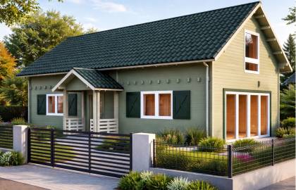 Domek drewniany Chaber III o powierzchni całkowitej 45,2 m2 (33,6 m2+taras) umożliwia budowę na zgłoszenie! Ten przestronny i funkcjonalny projekt sprawdzi się zarówno jako całoroczny i letniskowy domek na prywatnej działce, jak i pod cele inwestycyjne (wynajem, czy deweloperka).