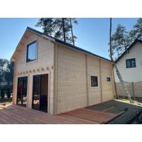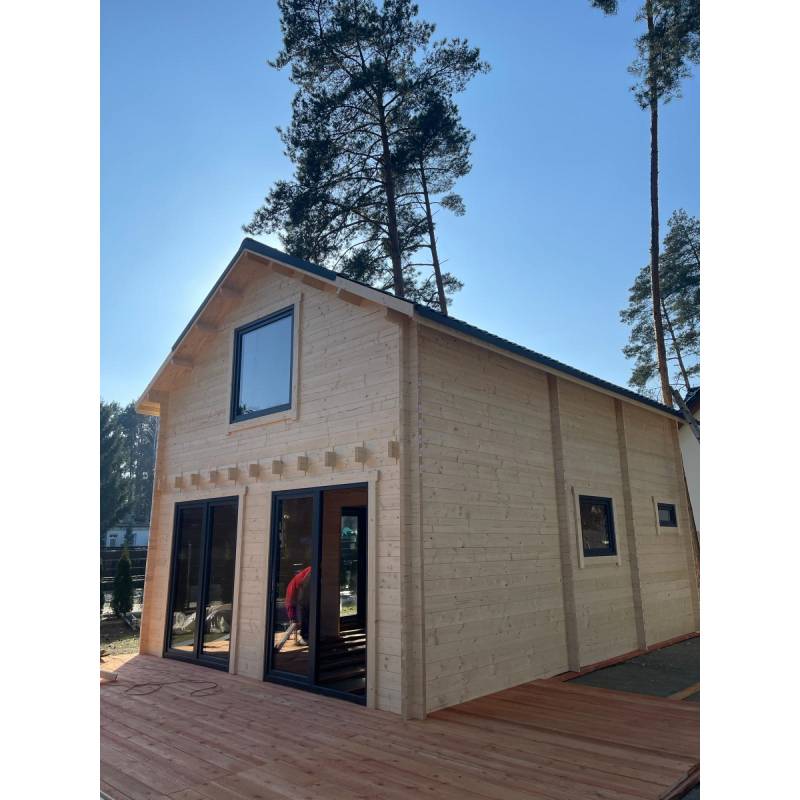 Dom wykonany jest z najwyższej jakości czterostronnie struganych balików o grubości 70 mm. Przy montażu korzystamy z precyzyjnej technologii na podwójne "pióro i wpust", co gwarantuje trwałość na lata. Dom posiada dwuspadowy dach o powierzchni 46,42 m2 i kącie nachylenia 30 °. W standardzie podłoga jest o grubości 28 mm. Dom jest wyposażony w potrójnie szklone okna PVC oraz w pełni ocieplony wełną 15 cm, co zapewnia optymalną izolację cieplną i akustyczną.