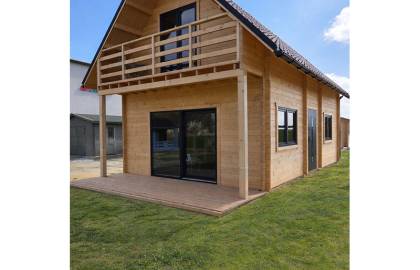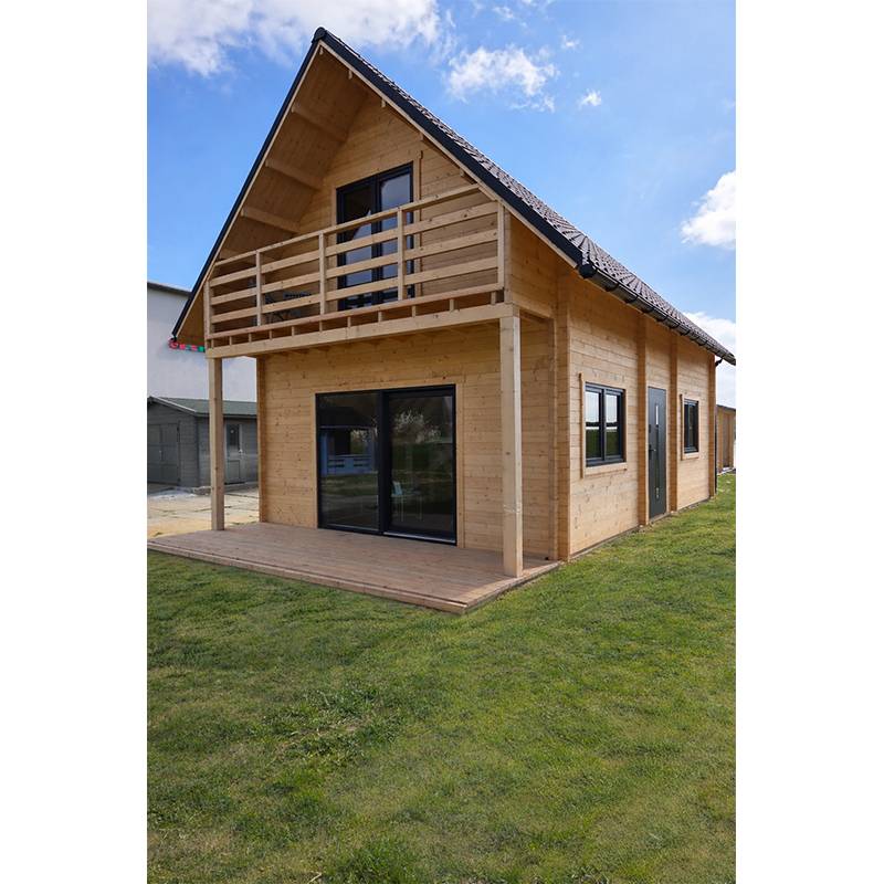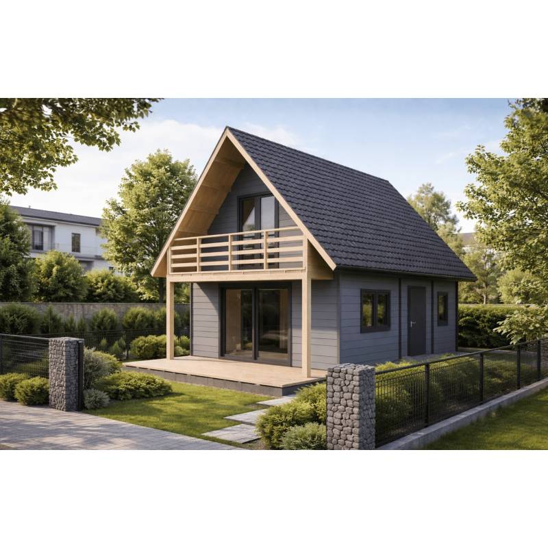 Domek drewniany Batumi o powierzchni 75m2 to urokliwe miejsce, łączące nowoczesność z przytulnym charakterem. Zbudowany z solidnego drewna, oferuje otwartą przestrzeń na parterze do dowolnej aranżacji, łazienkę, antresolę i dwie osobne sypialnie na piętrze. Przeszklenia na froncie zapewniają dużo światła i piękne widoki, a balkon na piętrze umożliwia relaks na świeżym powietrzu. Domek Batumi to idealne miejsce do życia z dala od miejskiego zgiełku, łączące funkcjonalność z estetyką.