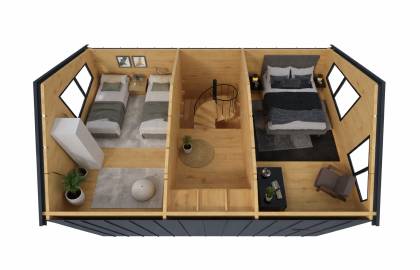 Dzięki przeszklonej ścianie frontowej wnętrze jest maksymalnie doświetlone światłem słonecznym. Na parterze znajduje się duża otwarta przestrzeń (ok. 30 m2), umożliwiająca zaaranżowanie salonu z aneksem kuchennym, a także łazienka z oknem (ok. 4 m2). Na piętro prowadzą wygodne schody (do wyboru kręcone bądź zabiegowe). Znajdują się tam dwie przestronne i słoneczne sypialnie (ok. 10 m2 i 12 m2) z dużymi oknami trapezowymi (150x150 cm), a także antresola do dowolnej aranżacji.