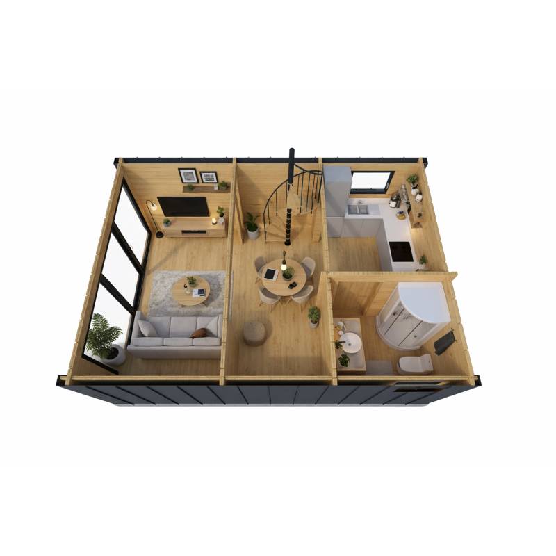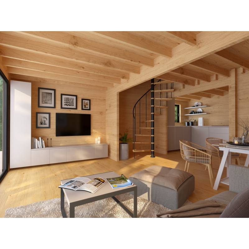 Ściany domu osiągają wysokość 428,7 cm, a w punkcie szczytowym sięgają 566,4 cm dzięki czemu wnętrze jest niezwykle przestronne i funkcjonalne. Podłoga o grubości 28 mm postawiona jest na ciśnieniowo zaimpregnowanych legarach. Dodatkowo dwuspadowy dach o powierzchni 41,96 m2 i kącie nachylenia 30°, a także ściany boczne zostały pokryte wysokiej jakości blachą na rąbek.